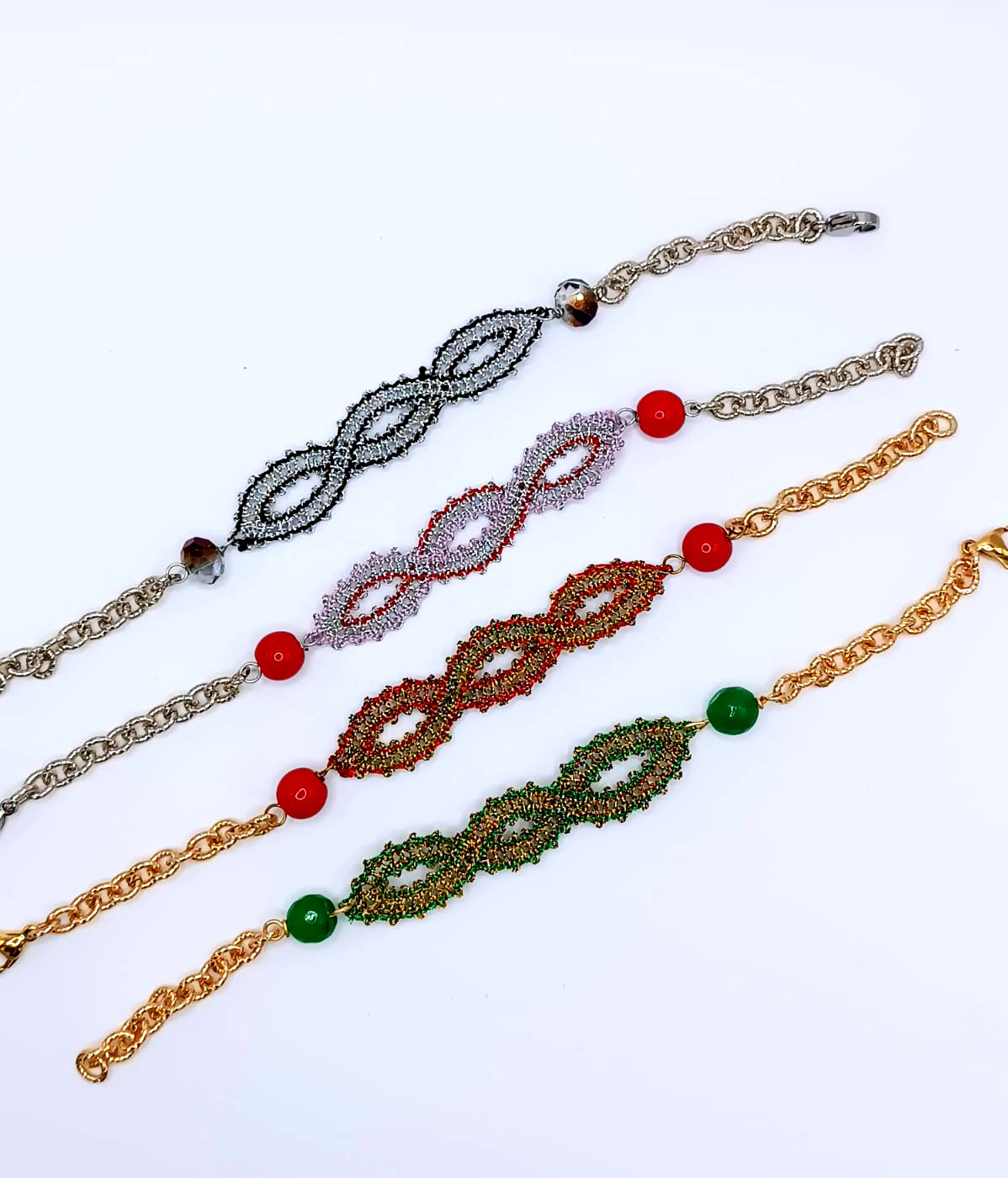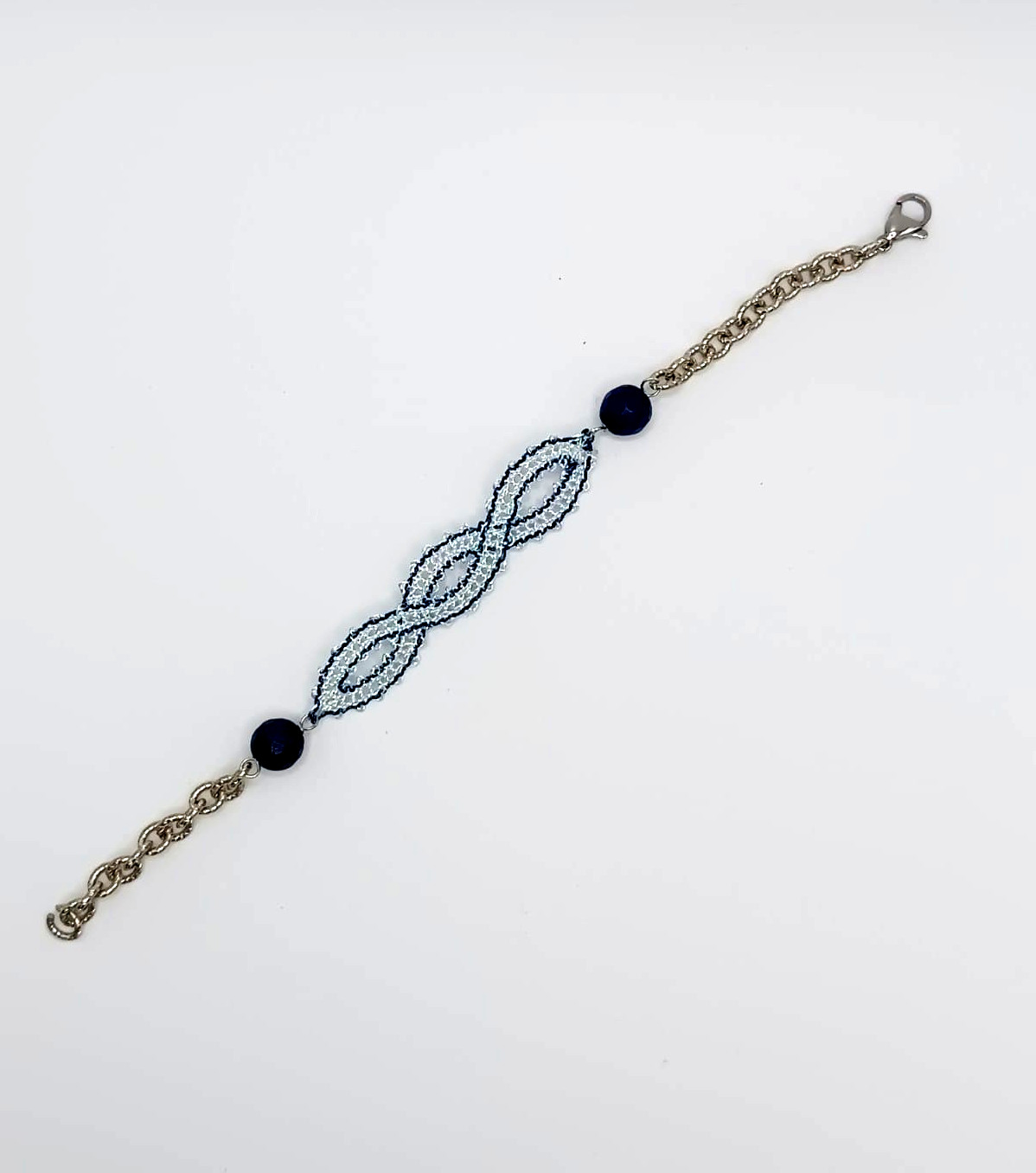 Questo delicato bracciale con il Doppio Infinito è realizzato a mano con l’intreccio di fuselli, utilizzando il filo Lurex e la tecnica del Punto Tela.