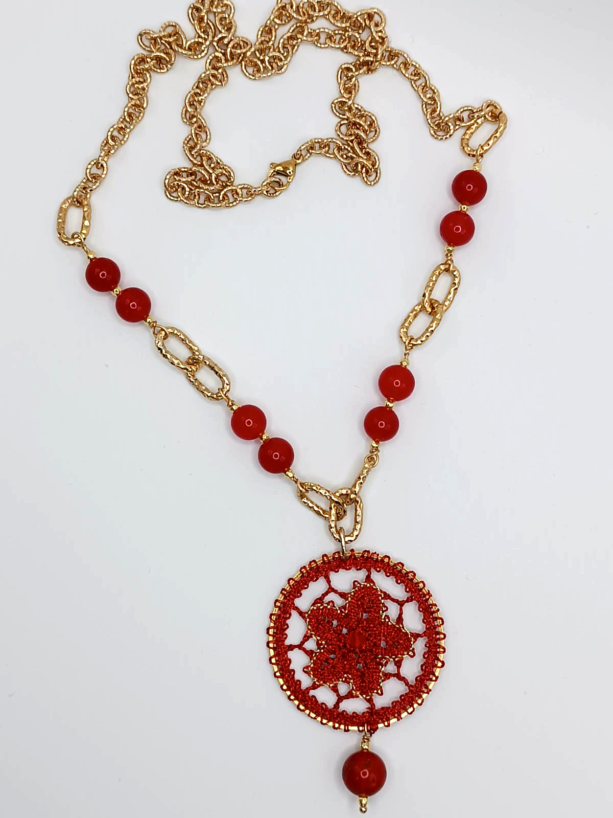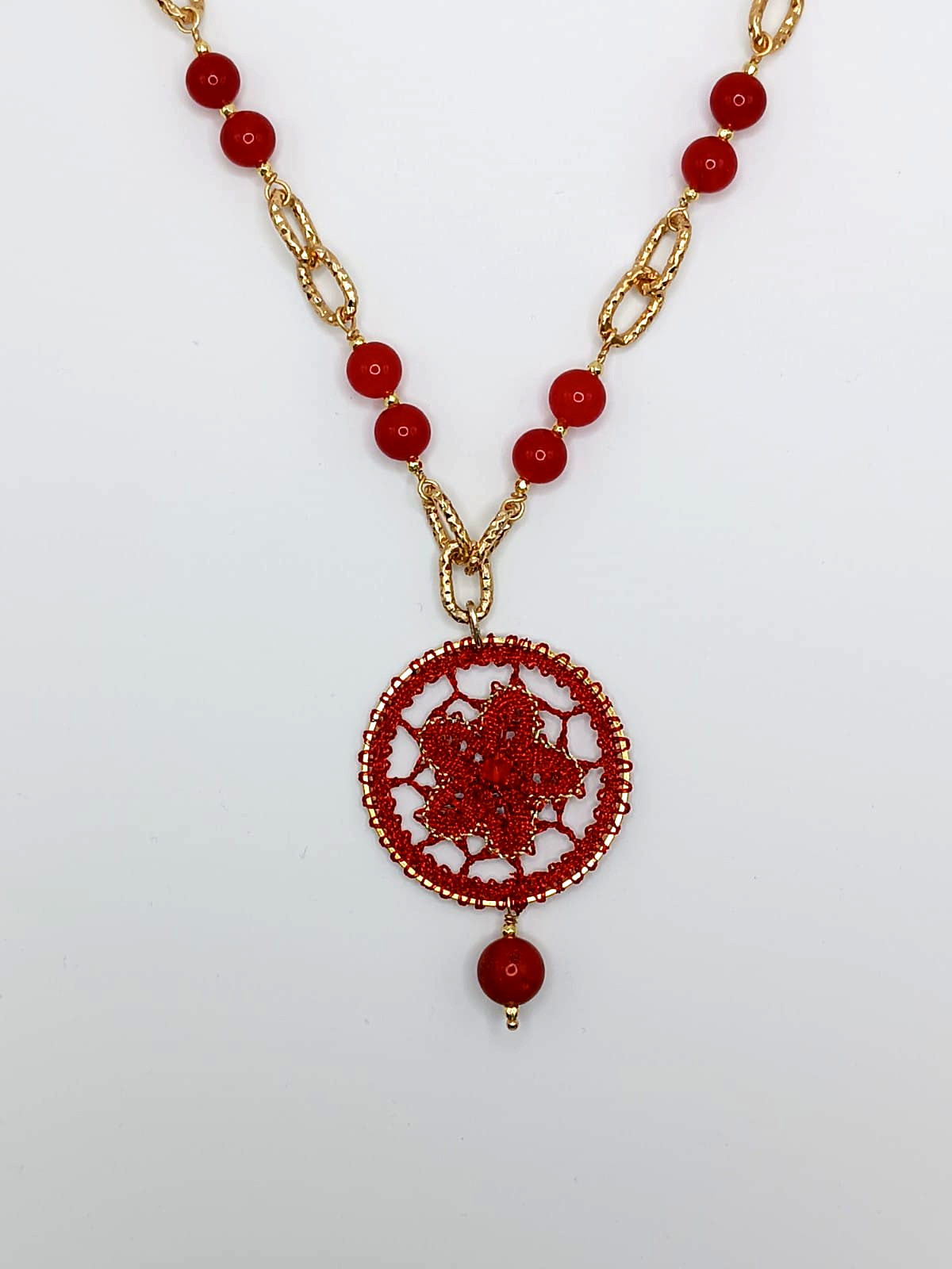 Il fiore più bello e delicato adesso è rappresentato su una collana realizzata con intrecci di fuselli all’interno di una struttura circolare di diametro 4.