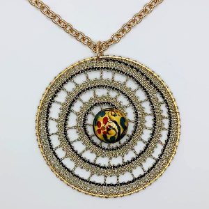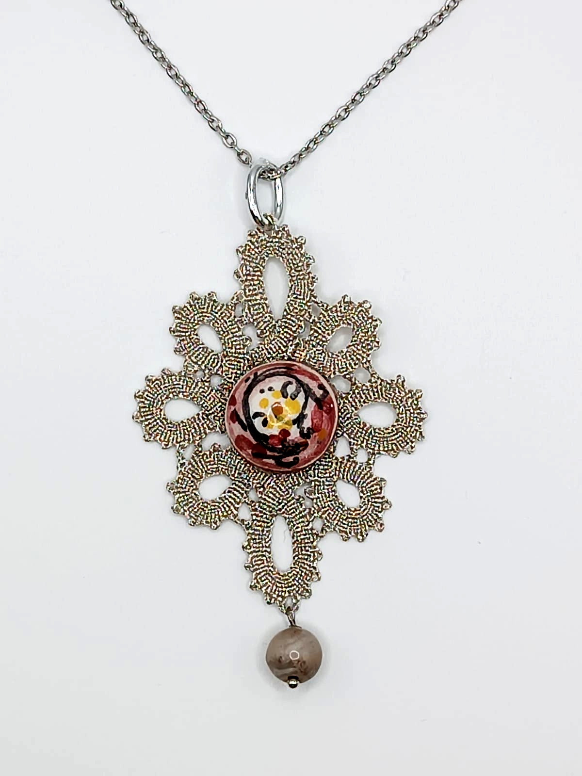 La collana Rombo è realizzato con intrecci di fuselli con il filo Lurex in pizzo di Cantù.